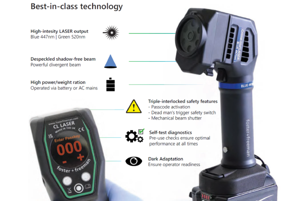 Idéalement conçue comme lampe de terrain crime ou lampe de laboratoire crime, elle est disponible en bleu (447 nm) et vert (520 nm), et permet de révéler des indices cruciaux grâce à une illumination puissante et ciblée :
